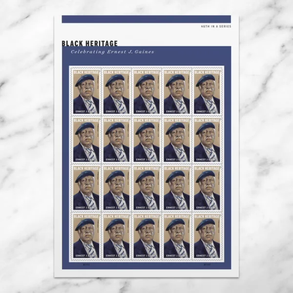 The 46th stamp in the Black Heritage series honors author Ernest J. Gaines (1933?C2019). Best known for such novels as The Autobiography of Miss Jane Pittman and A Lesson Before Dying, Gaines drew from his childhood as the son of sharecroppers on a Louisiana plantation to explore the untold stories of rural African Americans.